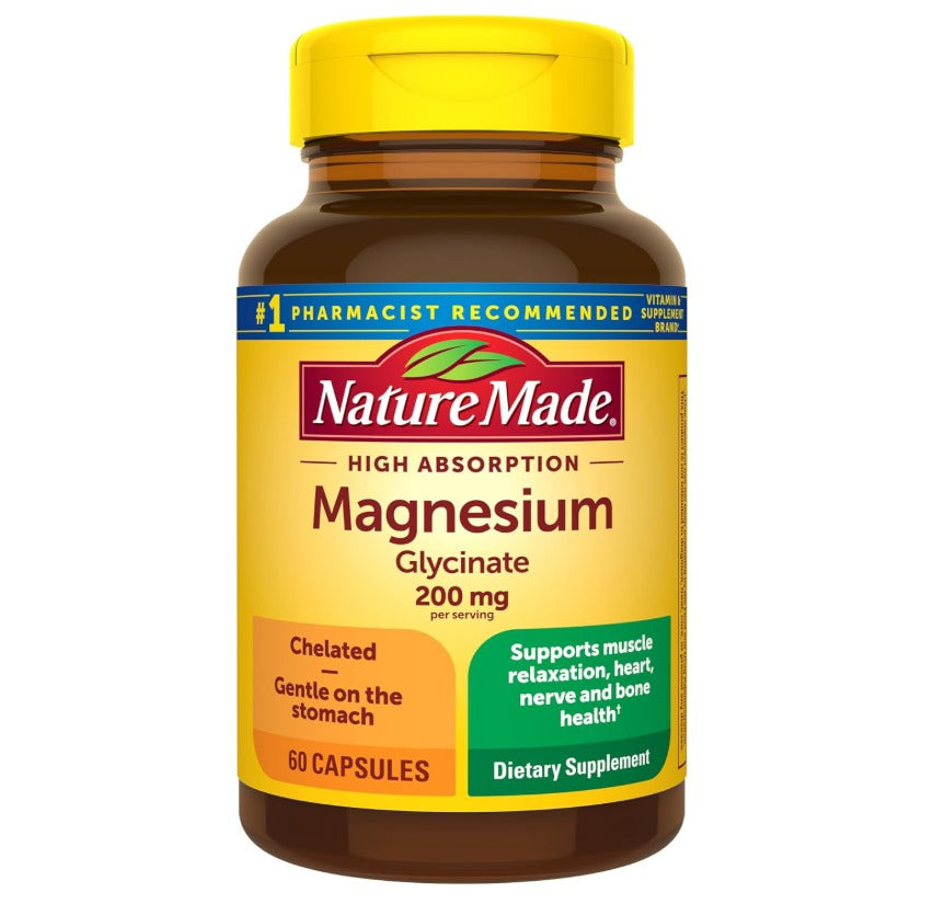 - Suplemento de apoyo para el corazón, los nervios y los huesos: contiene una botella de 60 unidades de glicinato de magnesio Nature Made 200 mg por porción cápsulas para un suministro de 30 días